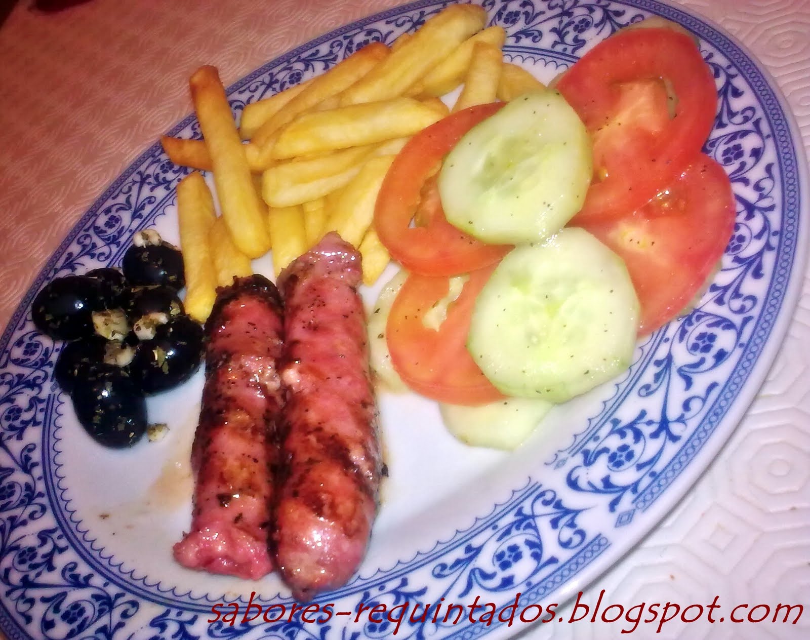 Servi com batata frita, salada de pepino e tomate, e azeitonas temperadas com alho e oregãos.