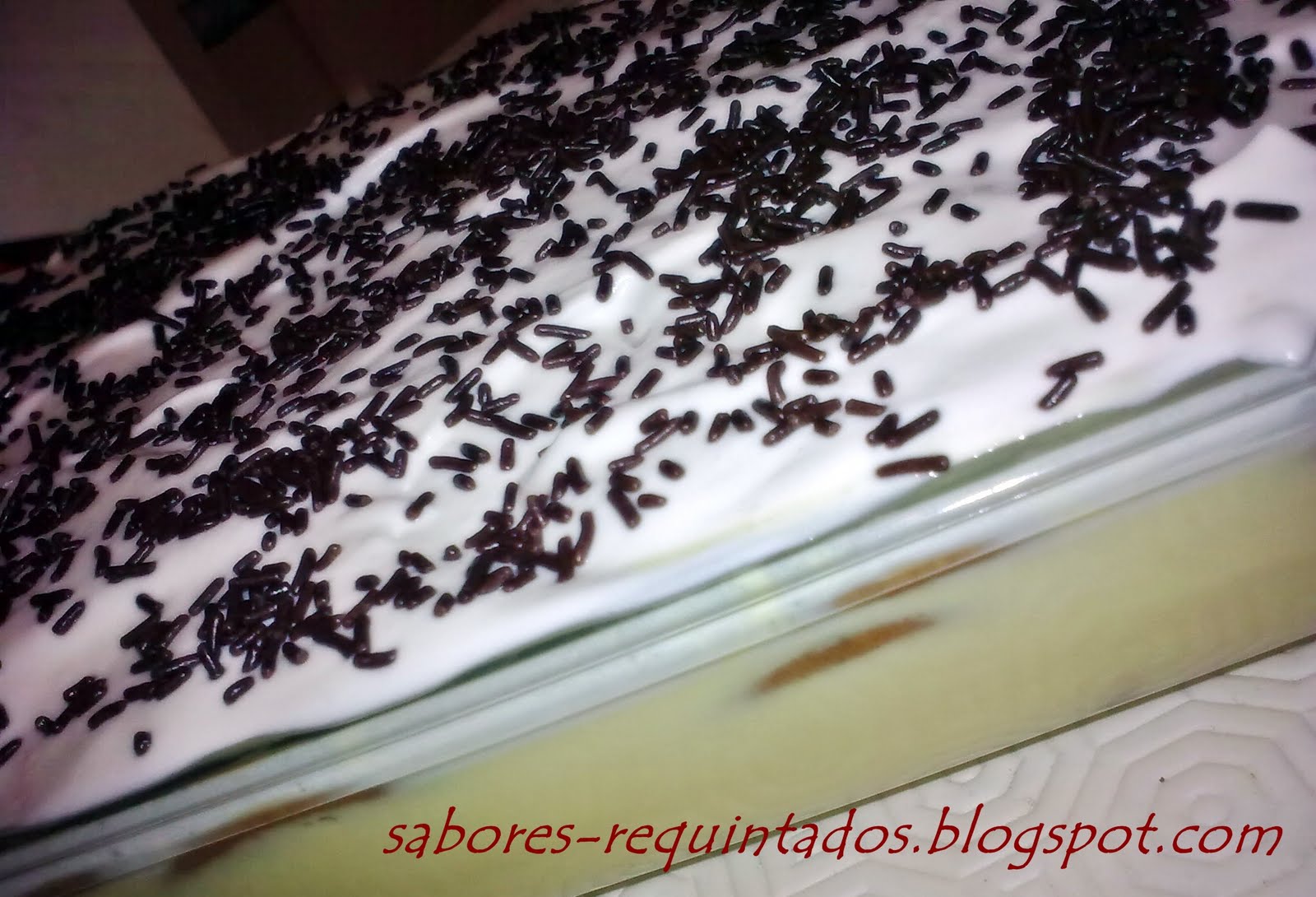 Entretanto bate-se os 100ml de natas restantes com o açúcar baunilhado. Adiciona-se ao preparado anterior, envolvendo bem.